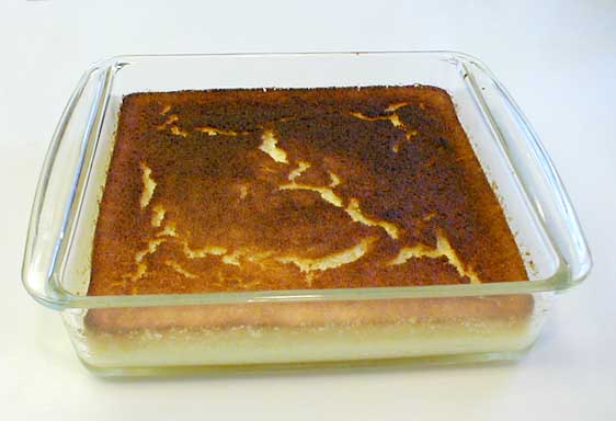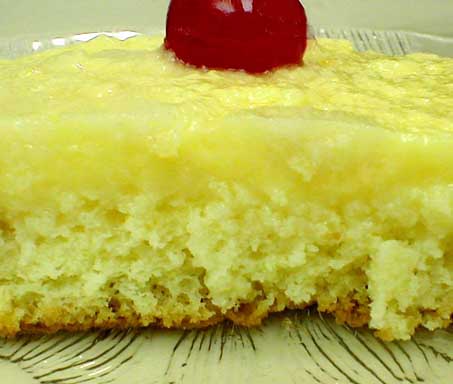 After baking, the dessert will have custard on the bottom and sponge cake on the top. I usually serve it inverted with the custard on the top.
